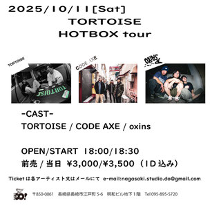 2025/10/11[Sat] TORTOISE HOTBOX tour -CAST- TORTOISE / CODE AXE / oxins OPEN/START 18:00/18:30 前売/当日 ¥3,000/¥3,500(1D込)